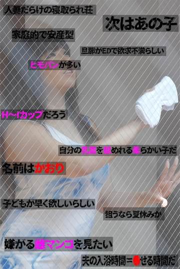 「家庭的で安産型」「旦那がEDで欲求不満らしい」「ヒモパンが多い」「H~Iカップだろう」「名前はかおり」「●供が早く欲しいらしい」「狙うなら夏休みか」「●がる雌マンコが見たい」