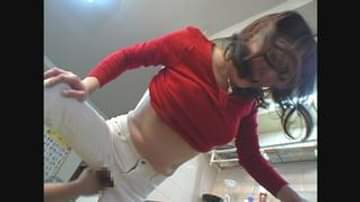 生地が張り裂けそうなほどのむっちり感。下腹肉弄り