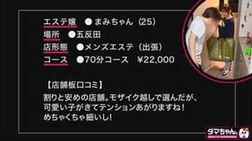 ----------------------------------------------------【今回のメンエス嬢】・まみちゃん(25歳)塩対応!?だがそれが逆にイイ! スレンダー美ボディ美少女!!【料金】70分コース・指名、出張料込み¥22,000・五反田(メンズエステ)【感想】五反田のメンエス...。ヌキ、期待しちゃいますよね?w今回は下調べなしでパネルモザイク越しに直感で選んだ子を呼んでみました!めっちゃスレンダーでかわいい系お姉さん!だがなかなかの塩対応系...!キャピキャピとはしておらず、少し不安もありましたが、プレイ交渉時に自慢の太マラwを見せつけながら交渉すると、 「まぁ...おっきぃし、いいかな...」とまさかのオッケー出ましたwww(多少のお小遣い交渉もありましたがw)そしていざフェラが始まると夢中で舐め続けてくれるムッツリ嬢!さてはこの子、塩対応気味ではあるもののスキもんだな...!?挿入すると「んっ...あぁっ...あんッ」と、しっかりエッチな顔をしながらしっかり感じている様子!この子、お愛想を振りまくのが下手なだけです!しっかりエッチなお姉さんです!!!騎乗位では自ら腰を動かし、「あっあっあっヤバい、イクイク...!!」とビクイキ!!!体位を変えつつ、女の子のツボを探っていると徐々にエロモードが盛り上がってきたのか「あ~~~きもちぃ~~~イクイクイク!!」と、またすぐ絶頂!!!イッたと思いきやまたすぐに「またイッちゃう!あ~きもちぃ!イック~イクイク!!」塩対応メンエス嬢、チ●コで理解(わか)らせてみましたw---------------------------------------------------------------【 タイムスケジュール】00:00~ 作品紹介~来宅00:50~ 説明~会計03:37~ 着替え●●06:00~ オイルエステ開始18:30~ 鼠径部マッサージ19:50~ 交渉開始21:50~ 手コキ23:50~ フェラ 26:30~ パイ揉み~乳首責め 28:50~ 手マン~クンニ32:00~ 本番交渉33:10~ 正常位35:30~ 騎乗位~背面騎乗位39:15~ バック~寝バック41:30~ 横バック43:30~ 正常位46:12~ フィニッシュ腹出し -------------------------------------------------------------【身バレ即配信停止】素人ハメ撮りクルー『だまちゃん。』による超グレーな完全個人撮影モノ!!!※無許可素人作品につき取り下げ可能性がある作品になります。P11